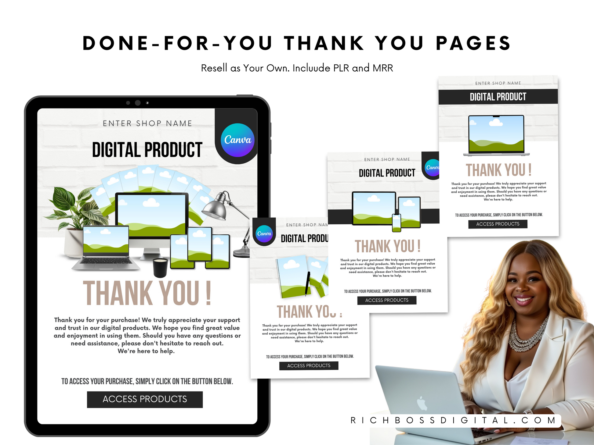 Transform your digital product delivery with this Done-for-You Canva Template for high-quality, professional "Thank You" and download instruction pages. Perfect for sellers on platforms like Etsy, Shopify, or social media. Use it to impress your customers or resell it for profit—keeping 100% of the earnings!